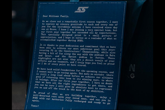 Карлос Сайнс поздравил сотрудников команды с наступающими праздниками памятными подарками и письмом, поблагодарил всех в Williams за успешный сезон. Фотографию и текст этого письма гонщик Williams опубликовал в социальных сетях. Карлос Сайнс: «Завершая наш замечательный первый совместный сезон, я хочу выразить искреннюю благодарность каждому из вас за невероятно теплый прием, оказанный мне с первого дня в Гроуве. Я знал, что становлюсь гонщиком особенной команды, но наш первый год превзошел все мои ожидания. Это письмо – небольшой жест благодарности, который будет напоминать нам о том, чего мы достигли вместе в 2025 году. Благодаря вашей самоотверженности и целеустремленности мы добились нашей амбициозной цели, заняв пятое место в Кубке конструкторов, поднявшись на подиум в Баку и Катаре, и заняв призовое место в спринте в Остине. Эти достижения – не мои заслуги, это результат ваших усилий и нашей командной работы. Я искренне надеюсь, что вы так же, как я, гордитесь каждым заработанным