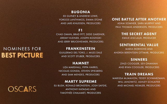 Π ΠΠΎΠ»Π»ΠΈΠ²ΡΠ΄Π΅ ΠΎΠ±ΡΡΠ²ΠΈΠ»ΠΈ Π½ΠΎΠΌΠΈΠ½Π°Π½ΡΠΎΠ² Π½Π° 98-Ρ ΠΏΡΠ΅ΠΌΠΈΡ Β«ΠΡΠΊΠ°ΡΒ». Π€ΠΈΠ»ΡΠΌ F1 The Movie , ΡΠ°ΡΡΠΊΠ°Π·ΡΠ²Π°ΡΡΠ΅ΠΉ ΠΈ Π²ΡΠΌΡΡΠ»Π΅Π½Π½ΠΎΠΉ ΠΊΠΎΠΌΠ°Π½Π΄Π΅ Π€ΠΎΡΠΌΡΠ»Ρ 1 ΠΈ Π²ΠΎΠ·Π²ΡΠ°ΡΠ΅Π½ΠΈΠΈ Π²Π΅ΡΠ΅ΡΠ°Π½Π° Π‘ΠΎΠ½Π½ΠΈ Π₯Π΅ΠΉΡΠ° Π² ΠΈΡΠΏΠΎΠ»Π½Π΅Π½ΠΈΠΈ ΠΡΡΠ΄Π° ΠΠΈΡΡΠ°, ΠΏΠΎΠ»ΡΡΠΈΠ» ΡΡΠ°Π·Ρ Π½Π΅ΡΠΊΠΎΠ»ΡΠΊΠΎ Π½ΠΎΠΌΠΈΠ½Π°ΡΠΈΠΉ, Π² ΡΠΎΠΌ ΡΠΈΡΠ»Π΅ Π½Π° Β«ΠΡΡΡΠΈΠΉ ΡΠΈΠ»ΡΠΌΒ». ΠΠΎΠΌΠΈΠΌΠΎ F1 The Movie Π·Π° Π·ΠΎΠ»ΠΎΡΡΡ ΡΡΠ°ΡΡΡΡΠΊΡ Π² Π³Π»Π°Π²Π½ΠΎΠΉ Π½ΠΎΠΌΠΈΠ½Π°ΡΠΈΠΈ ΠΏΠΎΠ±ΠΎΡΡΡΡΡ ΠΊΠ°ΡΡΠΈΠ½Ρ Β«ΠΡΠ³ΠΎΠ½ΠΈΡΒ», Β«Π€ΡΠ°Π½ΠΊΠ΅Π½ΡΡΠ΅ΠΉΠ½Β», Β«ΠΠ°ΠΌΠ½Π΅ΡΒ», Β«ΠΠ°ΡΡΠΈ ΠΠ΅Π»ΠΈΠΊΠΎΠ»Π΅ΠΏΠ½ΡΠΉΒ», Β«ΠΠΈΡΠ²Π° Π·Π° Π±ΠΈΡΠ²ΠΎΠΉΒ», Β«Π‘Π΅ΠΊΡΠ΅ΡΠ½ΡΠΉ Π°Π³Π΅Π½ΡΒ», Β«Π‘Π΅Π½ΡΠΈΠΌΠ΅Π½ΡΠ°Π»ΡΠ½Π°Ρ ΡΠ΅Π½Π½ΠΎΡΡΡΒ», Β«ΠΡΠ΅ΡΠ½ΠΈΠΊΠΈΒ» ΠΈ Β«Π‘Π½Ρ ΠΏΠΎΠ΅Π·Π΄ΠΎΠ²Β». F1 The Movie ΠΏΡΠ΅ΡΠ΅Π½Π΄ΡΠ΅Ρ Π½Π° Β«ΠΡΠΊΠ°ΡΒ» ΠΈ Π² ΡΡΡΡ ΡΠ΅Ρ Π½ΠΈΡΠ΅ΡΠΊΠΈΡ Π½ΠΎΠΌΠΈΠ½Π°ΡΠΈΡΡ β Β«ΠΡΡΡΠΈΠΉ ΠΌΠΎΠ½ΡΠ°ΠΆΒ», Β«ΠΡΡΡΠΈΠΉ Π·Π²ΡΠΊΒ» ΠΈ Β«ΠΡΡΡΠΈΠ΅ ΡΠΏΠ΅ΡΡΡΡΠ΅ΠΊΡΡΒ». Π¦Π΅ΡΠ΅ΠΌΠΎΠ½ΠΈΡ Π½Π°Π³ΡΠ°ΠΆΠ΄Π΅Π½ΠΈΡ ΡΠΎΡΡΠΎΠΈΡΡΡ 15 ΠΌΠ°ΡΡΠ° 2026 Π³ΠΎΠ΄Π° Π² Dolby Theatre Π² ΠΠΎΡ-ΠΠ½Π΄ΠΆΠ΅Π»Π΅ΡΠ΅.